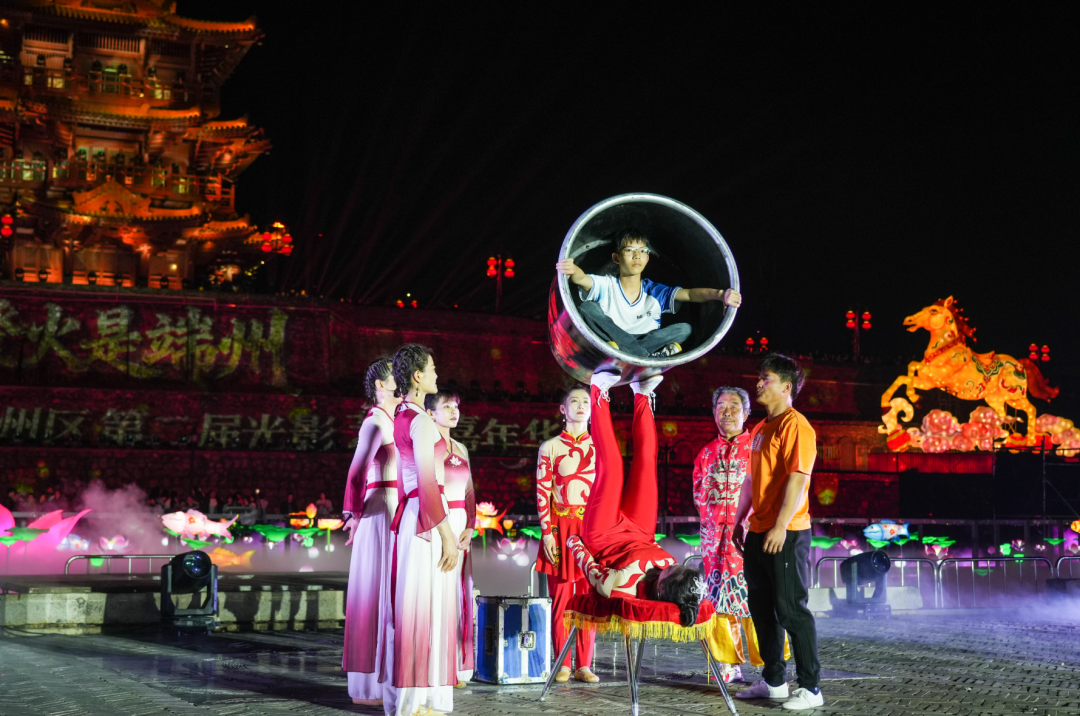 △民间杂技蹬缸表演,表演者与现场观众互动。肇庆市融媒体中心实习生 李梓骞 摄