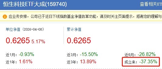 资料显示,恒生科技ETF大成成立于2021年5月18日,截至2026年4月8日,其累计收益率为-37.35%,累计净值为0.6265元。而从规模看,其截至去年底的管理规模高达189.75亿元。