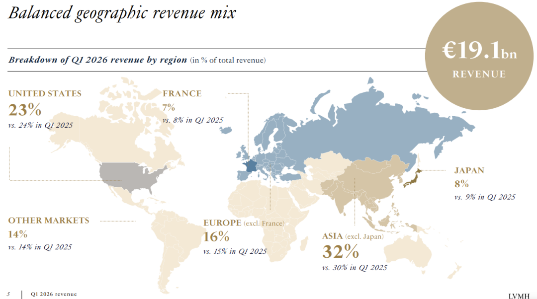 按地区划分,2026年第一季度,欧洲和日本的销售额均下降3%,而美国增长3%,亚洲其他地——包括关键的中国市场——销售额增长7%,超出预期。据Cécile Cabanis称,得益于中国农历新年的良好表现,这是自2023年以来该地区表现最好的一季。中国本地消费也有所增加。